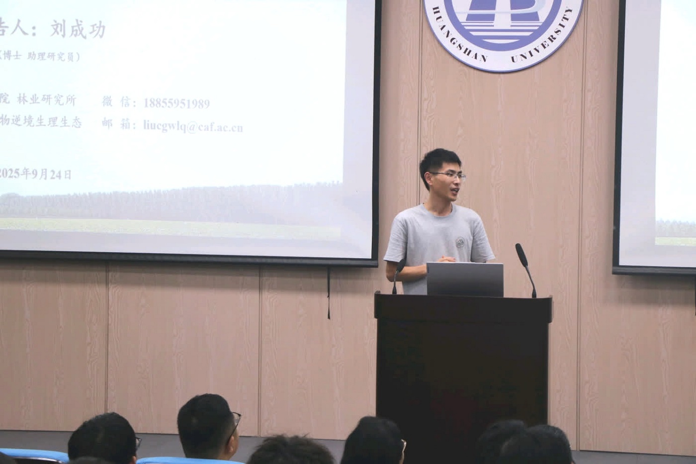 讲坛伊始,刘成功结合自身经历展开分享。他回顾了高考历程与大学阶段的心态变化,坦言最初加入项目组是为积累学分与综测成绩,却在参与过程中意外实现了实践能力与综合素养的双重提升,其真诚坦率的讲述引发在场学子共鸣。报告中,他回顾了从本科到博士阶段的学术进阶,从黄山学院林学专业开启林业领域的启蒙,到硕士、博士阶段深耕林木遗传改良研究,再到如今主持国家重点研发计划项目子课题、中央级公益性科研院所基本科研业务费专项资金项目等多个科研项目,骨干参与国家重点研发计划、国家自然科学基金等16项国家级项目。他以杨树遗传改良研究为例,分享了团队在种质资源收集与逆境生理研究中,如何面对野外采样的艰苦、实验重复的挫败,凭借“咬定青山不放松”的信念持续攻关。同时回忆了从本科到博士阶段,如何锚定林业科研的初心,在学业进阶与职业选择中坚定方向。