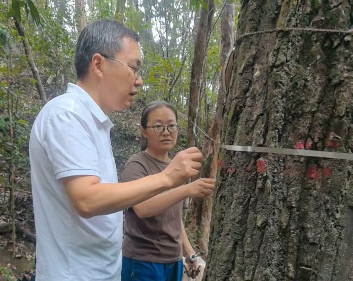 在实地样地考察环节,王宁宁博士与陈声文高工带领教师团队进入样地现场,并实地讲解了森林样地调查的关键技术要点和科研实践流程,使教师们对大尺度生态调查的标准化和数据化管理有了更为直观的认识。