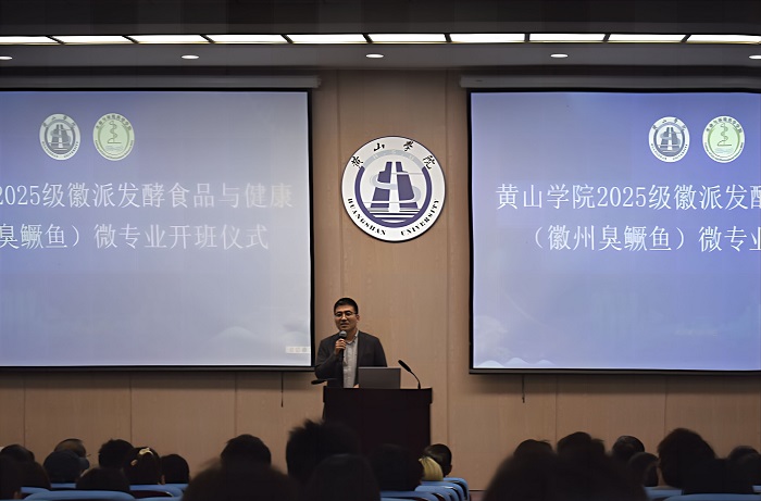 开班仪式上,微专业负责人吴永祥介绍了专业建设背景、培养目标与课程特色。该微专业依托太阳集团tyc151学科优势与黄山市特色发酵食品产业资源,围绕“健康中国”战略和地方产业发展需求,构建了以实践创新能力培养为核心的课程体系,涵盖发酵食品学、食品营养与健康等5门课程,实践学时占比超60%,并聘请政府部门及行业企业专家担任校外导师,推动产教深度融合。