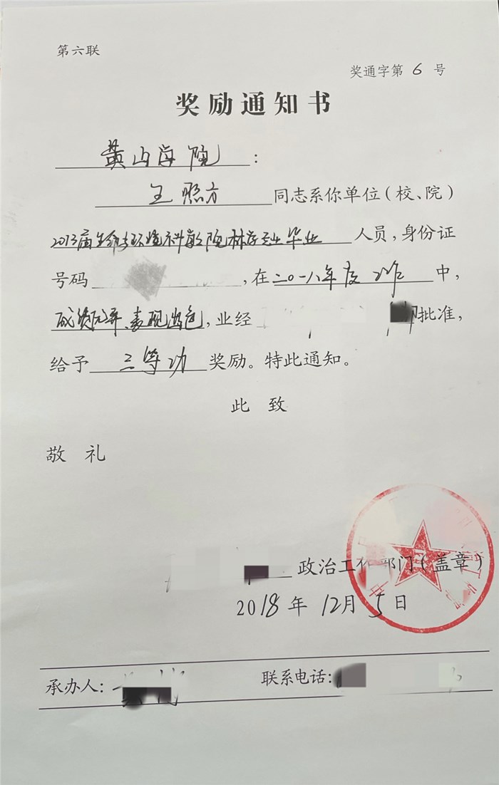该同学在校期间谨记校训、院训,表现积极踊跃,认真刻苦,作风优良。入伍后从普通士兵做起,秉承了一贯的优良作风,服役态度端正,政治立场坚定,思想积极进步,尊重上级、团结同志,精武强能,牢记使命,履行职责。因其在部队期间成绩优异,表现突出,荣获三等功。