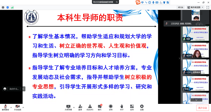 12月14日下午,生物技术专业利用腾讯会议召开了2022级本科生导师线上见面会。生物技术教研室全体教师、22级生物技术班全体学生参加了见面会。见面会由生物技术教研室主任董丽丽主持。