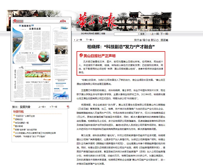 2023年2月8日出版的《黄山日报》以《柏晓辉:“科技副总”发力“产才融合”》为题,报道我院教师柏晓辉博士在黄山龙王潭生态园有限公司任职“科技副总”并以技术服务企业发展,发力“产才融合”,服务地方经济发展的事迹。