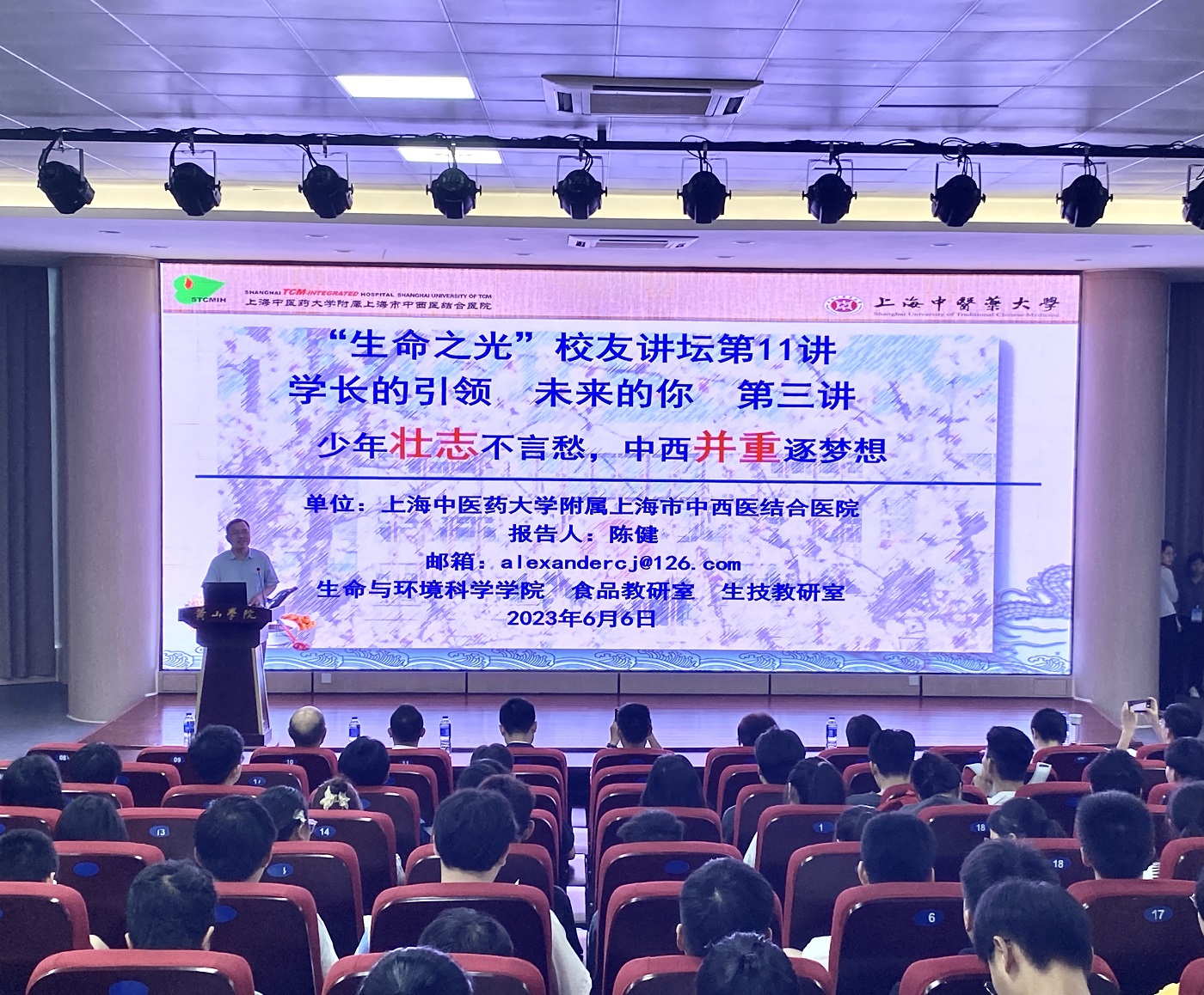 6月6日晚7时,太阳集团tyc151于文端楼二楼报告厅举办了“少年壮志不言愁,中西并重逐梦想”校友分享会。本次分享会邀请到的是黄山学院生物技术专业2010届优秀毕业生,上海中医药大学附属上海市中西医结合医院副研究员,上海中医药大学硕士研究生导师陈健。分享会由太阳集团tyc151党委副书记万志兵主持,院党委书记吕顺清,生物技术、食品科学与工程教研室二百余名师生参加此次报告会。