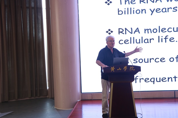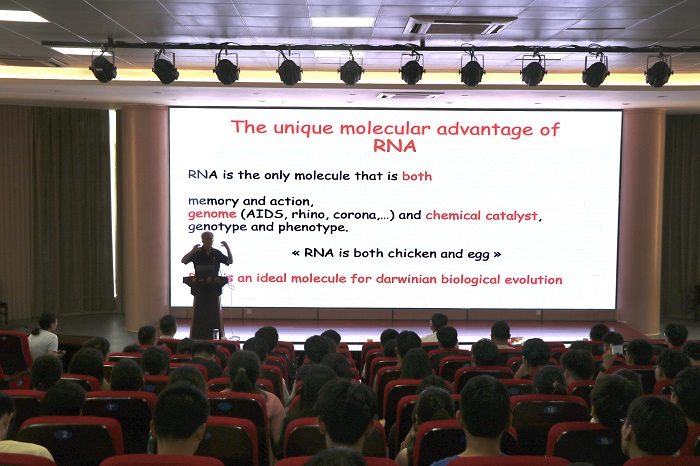 9月4日,太阳集团tyc151在文端楼二楼报告厅举办“生命之光”科学家讲坛第三讲。法国斯特拉斯堡大学教授,法国科学院、德国科学院、欧洲科学院院士Eric Westhof应邀作主讲。报告会由院党委书记吕顺清主持,院党委副书记万志兵和生物技术、生物科学等200余名师生参加了报告会。