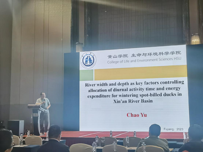 本次会议由安徽省动物学会主办,阜阳师范大学生物与食品工程学院、环境激素与生殖发育安徽省重点实验室承办。会议吸引了国内动物学及其相关领域的专家和学者,就“动物保护与人类健康”主题进行了多方面且深入的研讨和交流。我院于超博士在会议上作了题为《River width and depth as key factors controlling allocation of diurnal activity time and energy expenditure for wintering spot-billed ducks in Xin'an River Basin》的学术报告,向全省同行展示了黄山学院在鸟类学领域的最新研究工作。黄山学院师生积极与省内同行探讨动物学科学研究,在展现自身特色的同时,学习和吸收同行们的先进经验和长处。