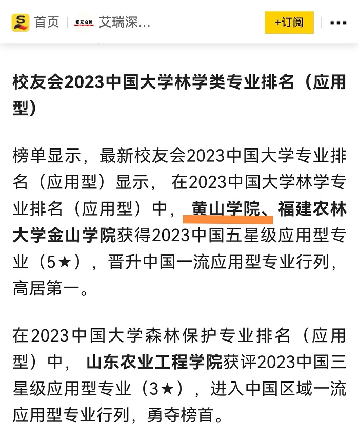 为了给2023年全国高考考生及家长选择报考林学类本科专业提供参考指南,全国第三方大学评价机构艾瑞深校友会网撰写完成、科学出版社即将出版发行的《2023校友会中国大学排名:高考志愿填报指南》最新发布校友会2023中国大学林学类专业排名。榜单显示,在2023中国大学林学专业排名(应用型)中, 黄山学院、福建农林大学金山学院获得2023中国五星级应用型专业(5★),晋升中国一流应用型专业行列,高居第一。