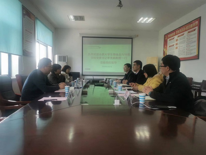 2024年3月7日,合肥大学生物食品与环境学院党委书记李秀娟教授、副院长笪春年、研究生秘书张金流、生物与医药硕士点负责人陈群、资源与环境硕士点负责人刘晓薇一行5人来我校太阳集团tyc151调研学科建设、硕士点筹备工作。太阳集团tyc151副院长万顺利接待合肥大学一行,生物技术、环境科学等相关专业教师参加座谈。