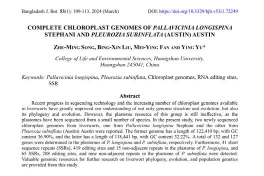 我院2018级生物科学班本科生宋哲明、刘炳辛以第一、第二作者的身份在SCI期刊《Bangladesh Journal of Botany》发表题为《Complete chloroplast genomes of pallavicinia longispina stephani and pleurozia subinflata (austin) austin》(DOI:10.3329/bjb.v53i1.72249)的研究论文。