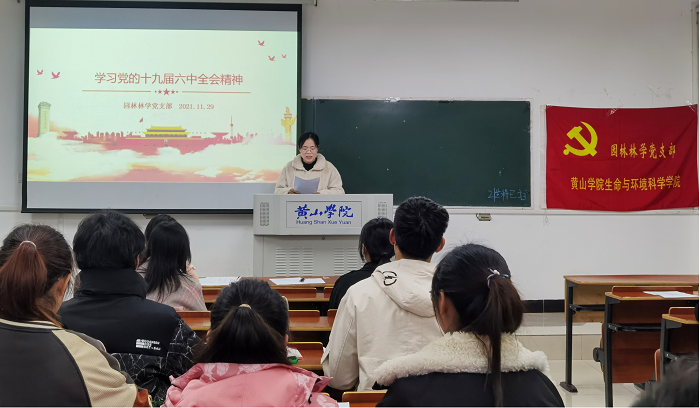11月29日,园林林学党支部于文渊楼1108教室集中学习党的十九届六中全会精神。支部书记刘璇、副书记杨蒙、组宣委员李燕、纪检委员蒋小凡以及47名党员参加会议。
