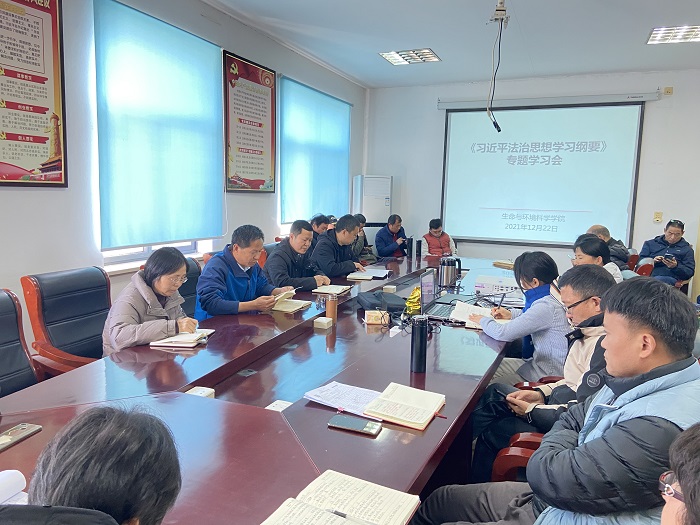 为全面贯彻习近平新时代中国特色社会主义思想,落实学校关于深入学习贯彻《习近平法治思想学习纲要》的通知,12月22日,生环学院召开理论专题学习会议,学习传达《习近平法治思想学习纲要》。全体教职工参加会议。学习会由吕顺清领学。